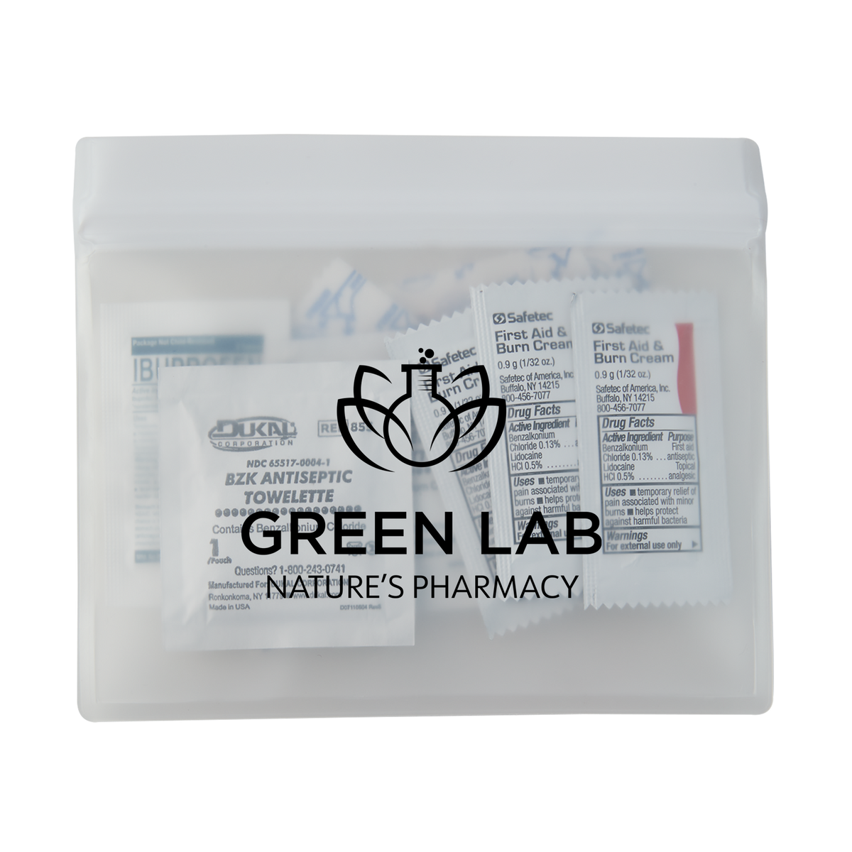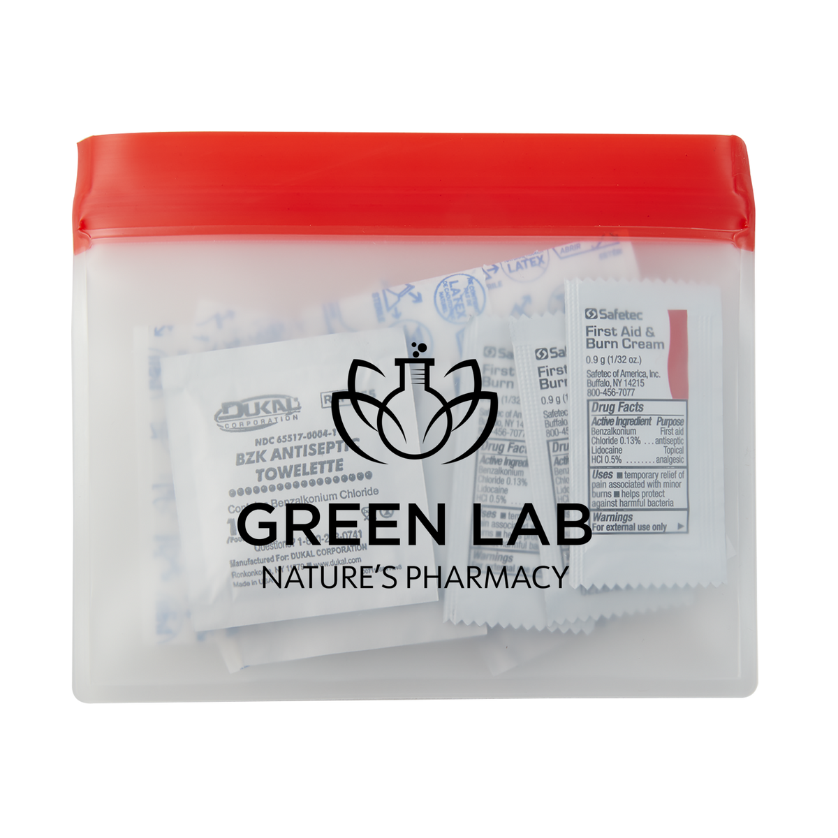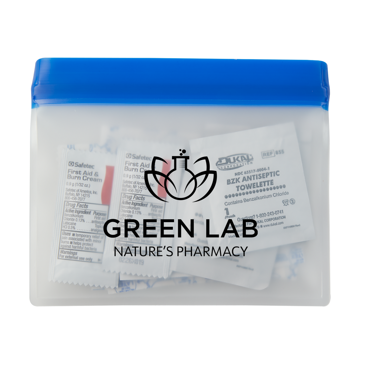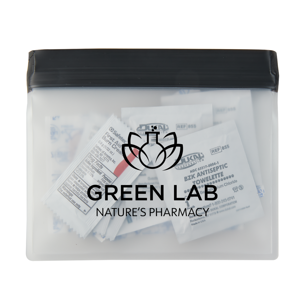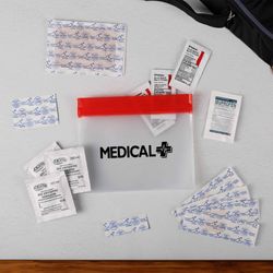 Reusable and washable PeVA Waterproof First Aid Kit features a ziplock closure on top of pouch. First Aid Kit includes 5 latex free bandages, 2 snip bandages, 3 first aid cream packets, 3 antiseptic towlettes, a 2" x 3" adhesive sterile pad and a 200mg Ibuprofen packet. White ink/imprint not available.