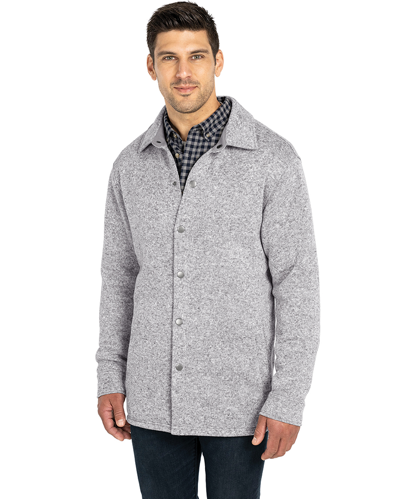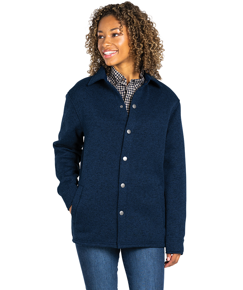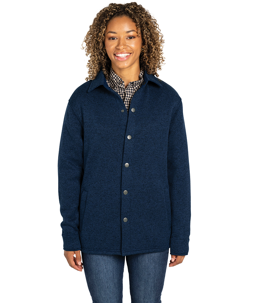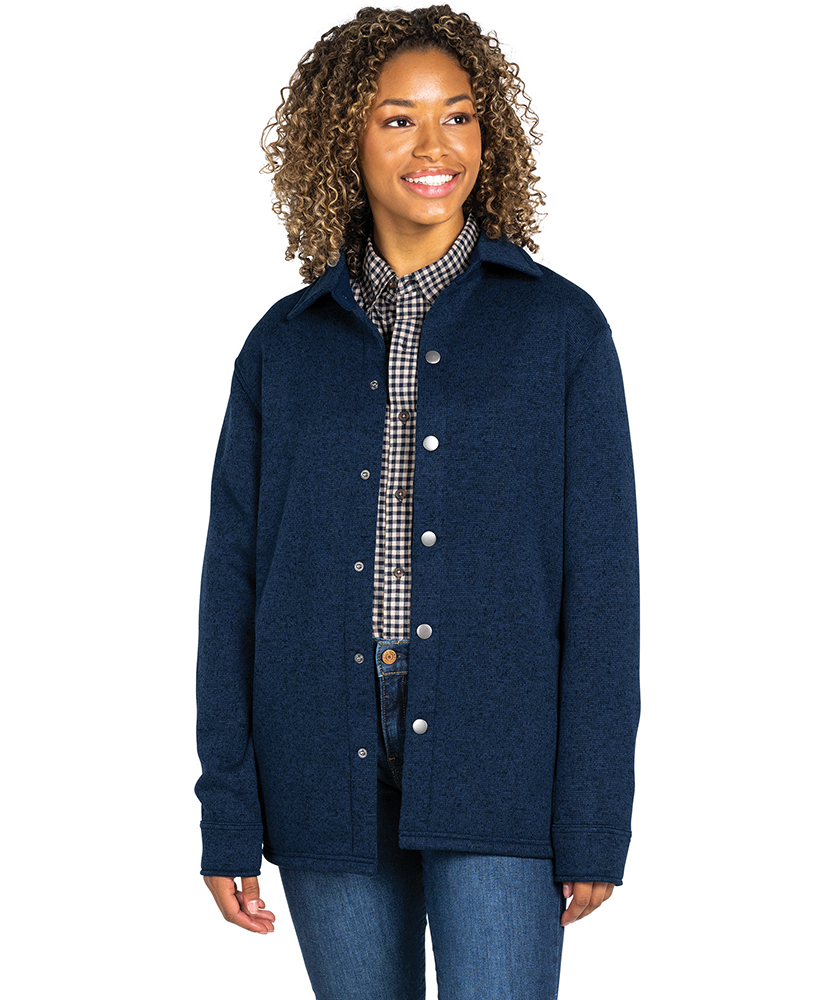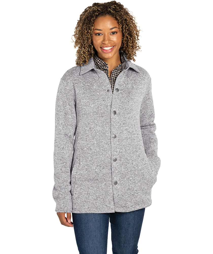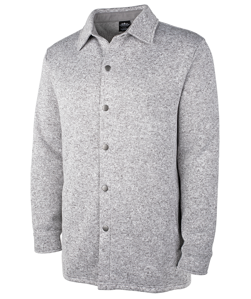 Perfect for everyday styles, the Heathered Fleece Snap Shacket is equal parts sweatshirt and jacket come together for a casual, elevated look. Made from 100% unique polyester fleece, this shacket's fabric is brushed on the inside for softness and yarn-dyed to produce a heathered appearance. Features snap placket with single-snap cuff for easy on-off. Available in multiple colors, this customized pullover makes a great giveaway at your next event!