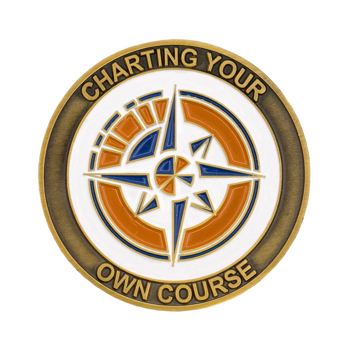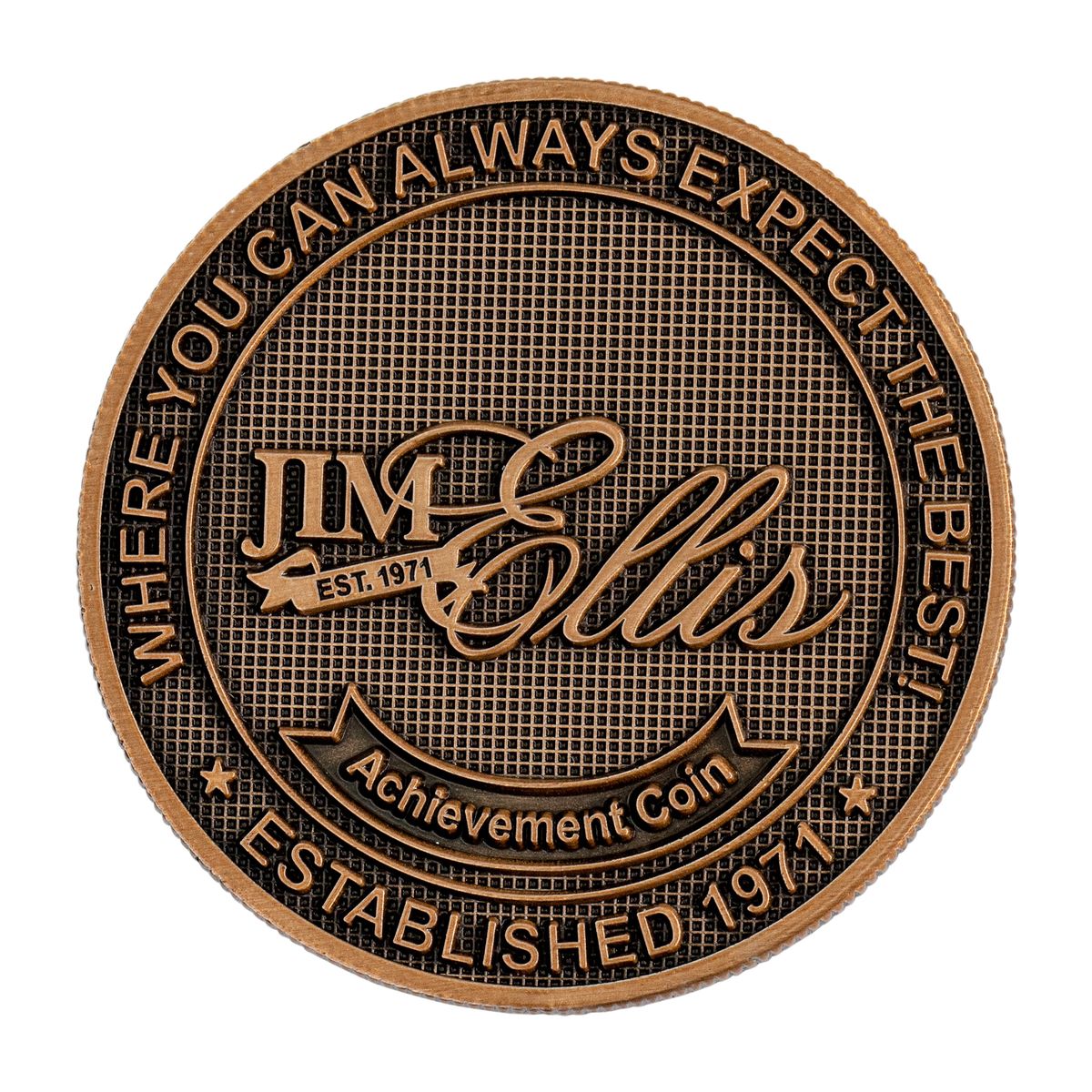 Pricing includes a custom shape die struck coin design with 2-dimensional relief on traditional brass metal. Up to 4 optional soft enamel colors are included with free PMS color matching. Choose from gold tone, nickel, copper, antique brass, antique nickel or antique copper metal finishes.